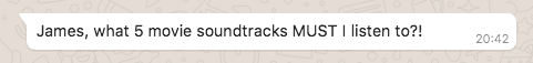 Well, Kee, you probably just wanted me to send you the names of 5 films and be done with it, but so many options began to rush through my head that it quickly became apparent that a simple Whatsapp response wasn’t going to be possible. I needed to explain my choices, talk about why I loved the music, etc etc. Had I the time, I’d have made a vlog in response, but perhaps I’ll have to do that when I’m a little less busy.